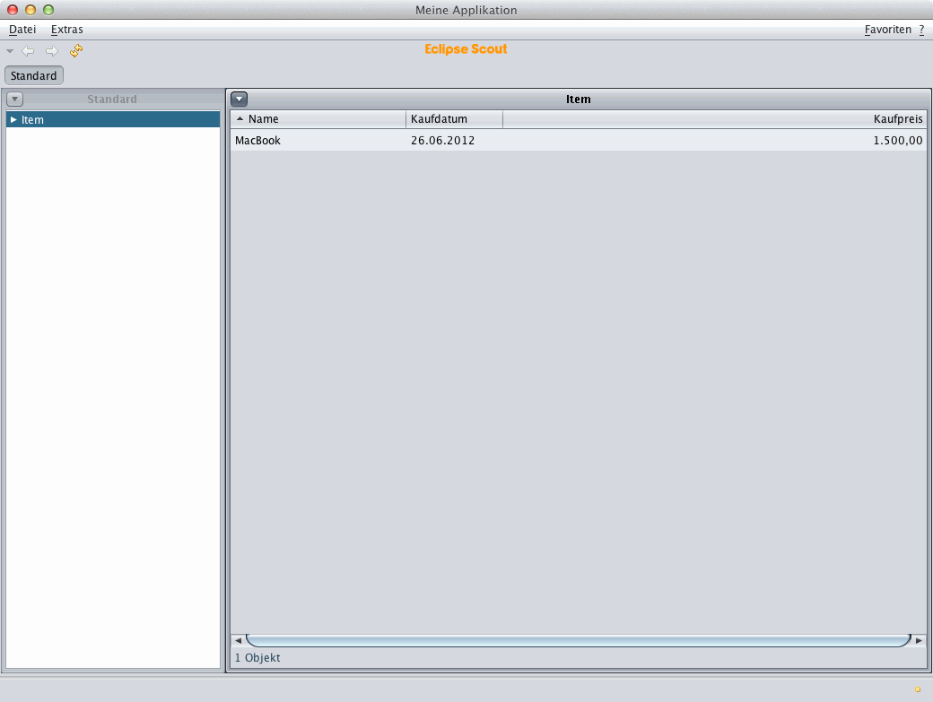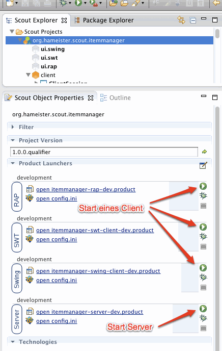 Nun ist die Beispielapplikation fertig und kann gestartet werden. Da es sich um eine Client-Server-Anwendung handelt, muss zuerst der Server und dann einer der Clients gestartet werden. Dazu selektiert man den Hauptknoten des Projekts im Scout Explorer org.hameister.scout.itemmanager, um die Product Laucher angezeigt zu bekommen: