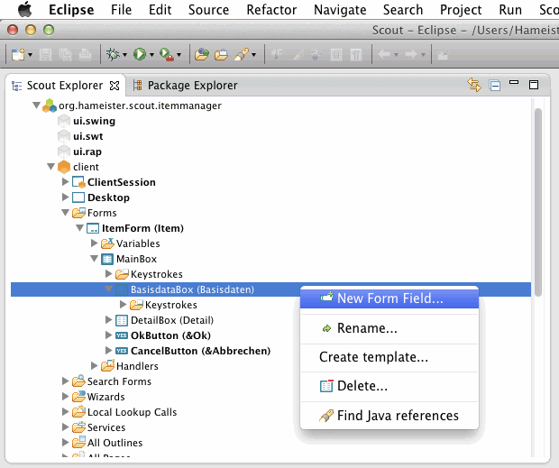 Was jetzt noch fehlt, sind die Eingabefelder in dem Formular. Zum Anlegen der Felder für die Eingabe der Basisdaten, wird BasisdatenBox selektiert und im Kontextmenü der Eintrag New Form Field... ausgewählt.