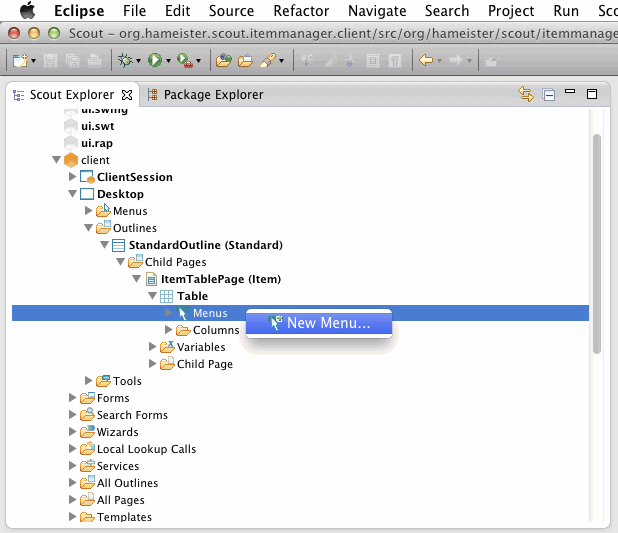 Damit die Dialoge aufgerufen werden können, müssen sie mit der ItemTablePage verbunden werden. Dazu klappt man im ScoutExplorer unter Outlines folgenden Pfad auf: Standard Outline->Child Pages->ItemTablePage->Table->Menus und wählt im Kontextmenü den Eintrag New Menu... aus: