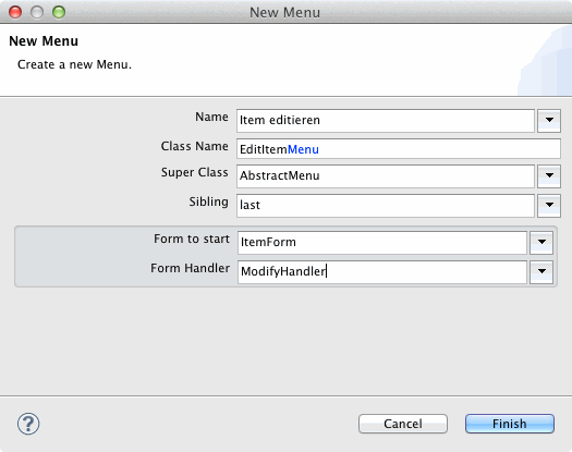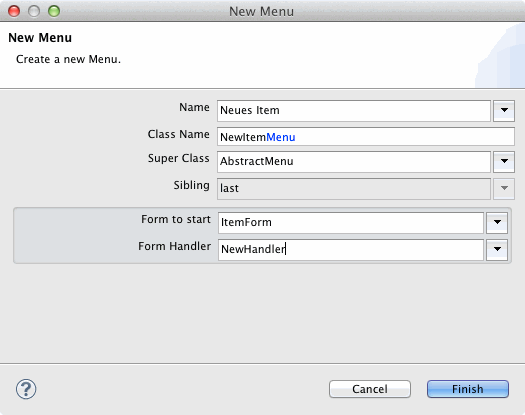 Im Wizard trägt man als Name den Wert Neues Item ein und gibt eine Übersetzung an. Unter Form to Start wird die oben erstellte Form ausgewählt: ItemForm. Als Handler wird der NewHandler verwendet.