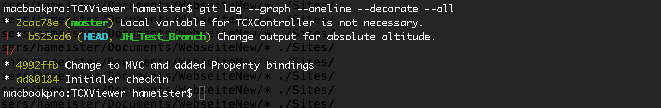 Zum Anlegen eines neuen lokalen Repositories wechselt man in das Verzeichnis, in dem sich die Daten befinden, die im Git abgelegt werden sollen. Beispielsweise: /Users/hameister/Documents/workspace/TCXViewer