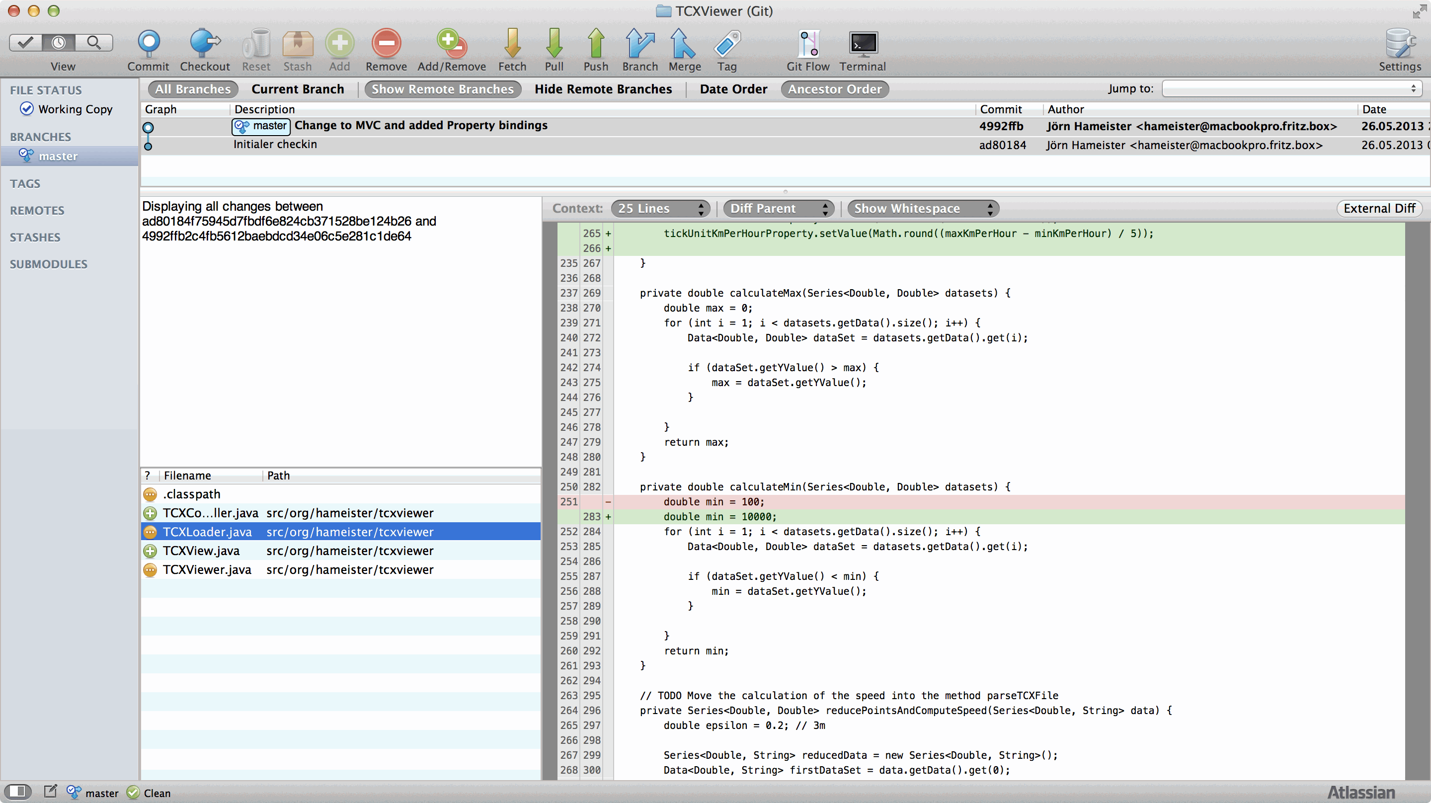 git status # On branch master # Changes to be committed: # (use "git reset HEAD <file>..." to unstage) # # modified: .classpath # new file: src/org/hameister/tcxviewer/TCXController.java # modified: src/org/hameister/tcxviewer/TCXLoader.java # renamed: src/org/hameister/tcxviewer/TCXViewer.java -> src/org/hameister/tcxviewer/TCXView.java # modified: src/org/hameister/tcxviewer/TCXViewer.java #