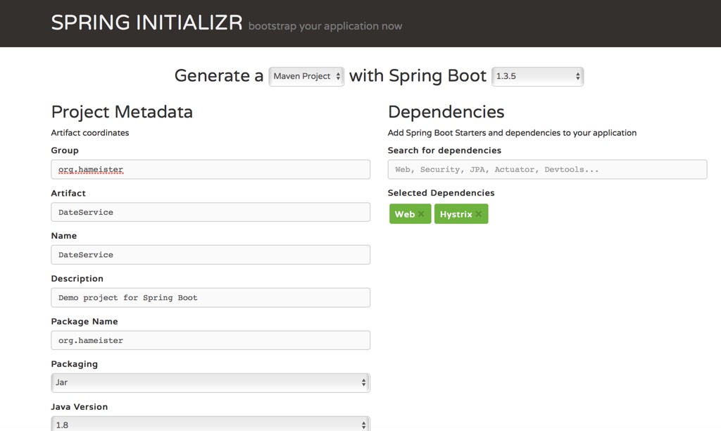 Los geht es auf der Seite start.spring.io. Wo Web und Hystrix ausgewählt wird, um anschliessend das Projekt-Template zu erstellen.
