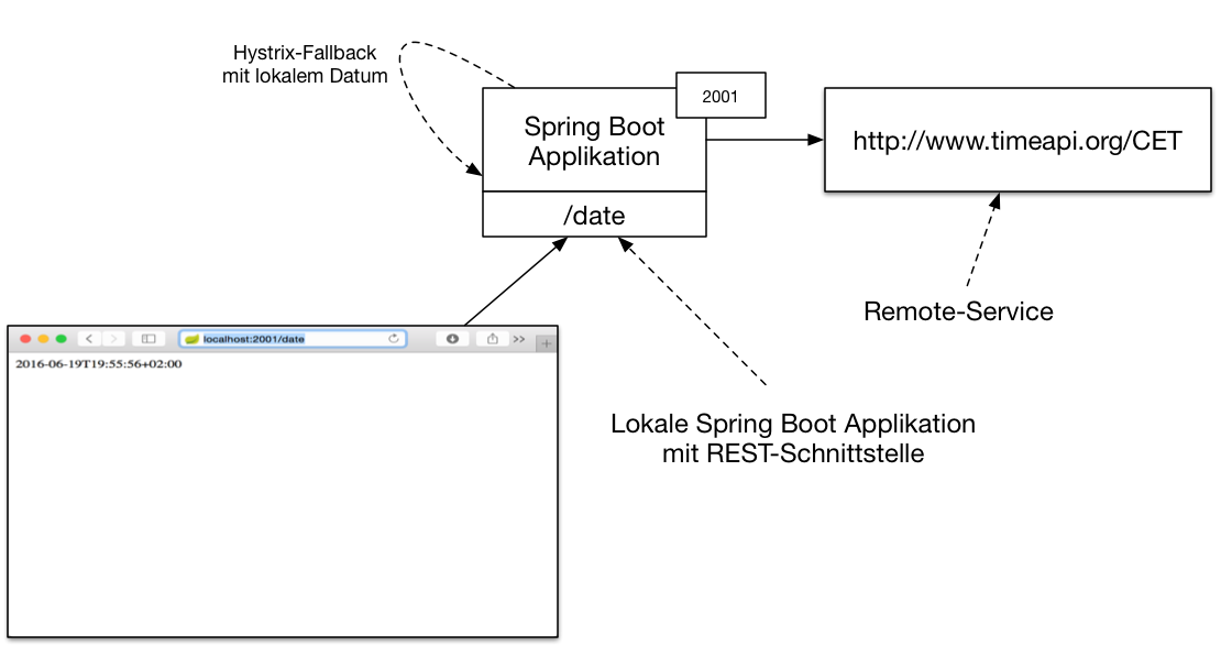 umgesetzt werden kann, um einen Remote-Call robuster zu gestalten. In dem Beispiel wird bei einem Remote-Service (http://www.timeapi.org/CET) das aktuelle Datum abgefragt. Lokal läuft eine Spring Boot Applikation, die über einen REST-Service auch eine Schnittstelle zum Abfragen des Datums zur Verfügung stellt, die mit einen Browser angesprochen wird. Im Fehlerfall wird über ein definierten Fallback das lokale Datum verwendet, um gegen den Ausfall des Remote-Service geschützt zu sein. Die lokale Spring Boot Applikation läuft unter dem Port 2001.