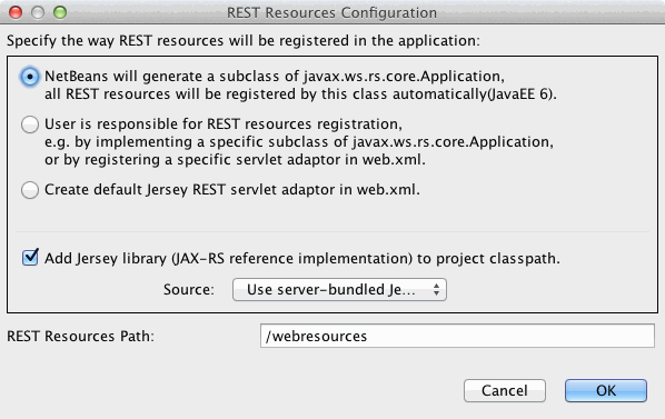 Zum Testen des REST-Service mit NetBeans muss als erstes die Anwendung auf dem Glassfish deployt werden. Beim ersten Deployment fragt NetBeans wie die Anwendung registriert werden soll.