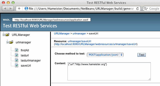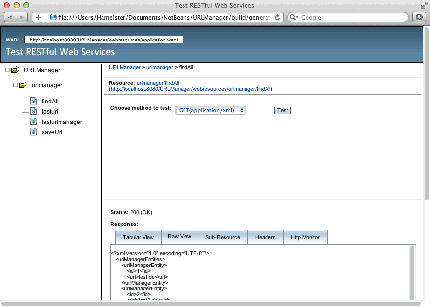 Daraufhin öffnet sich der Standard-Browser mit der Seite Test RESTful Web Services. Dabei handelt es sich um eine Anwendung zum Testen der REST Services.