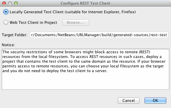 Anschliessend selektiert man das Projekt und wählt im Kontextmenü den Menüpunkt Test RESTful Web Services... aus. In dem Dialog ist der Punkt Locally Generated Test Client (suitable for Internet Explorer, Firefox) selektiert.