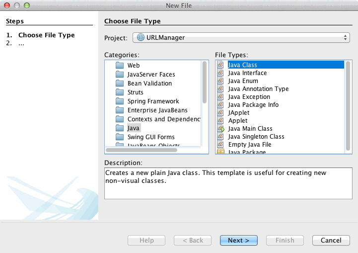 Im dritten Teil des Tutorials wird eine EJB (Enterprise Java Bean) erstellt. Dazu wird der Ordner Source Packages ausgewählt und zum Anlegen einer neuen Klasse die Tastenkombination ⌘+N verwendet. (oder über das Hauptmenü mit File->New File...). In dem Wizard-Schritt Choose file type wird unter Categories der Ordner Java ausgewählt. Als File Type wird Java Class selektiert und mit Next bestätigt.