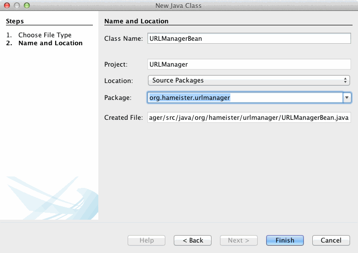 Im Schritt Name and Location wird als Class name der Wert UrlManagerBean eingetragen. Als Package wählen wir org.hameister.urlmanager und schließen den Dialog mit Finish.