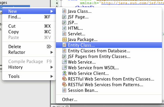 Als erstes wird Source Packages selektiert und im Kontextmenü New->Entity Class... auswählen.