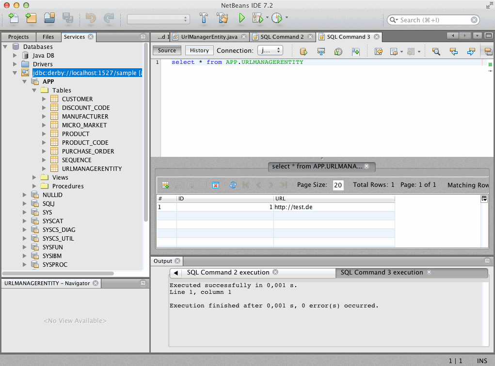 Man wechselt auf der linken Seite zu dem Reiter Services. Dort wählt man die Derby-Datenbank aus und verbindet sich mit Hilfe des Kontextmenüs (Connect...) mit der Datenbank. Unter APP->Tables->URLMANAGERENTIY ruft man im Kontextmenü View Data... auf.