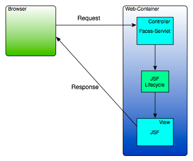 Man sieht, dass ein Request vom Browser, in dem der Web-Client läuft, an den Web-Container, in dem das Faces-Servlet läuft, gestellt wird. Das Faces-Servlet dient in diesem Kontext als Controller und arbeitet die Business-Logik ab. Dann wird das Erstellen der Antwort an die JSF-Seite weitergeleitet. Die View, die der Web-Container an den Browser als Response zurückgeliefert, wird also durch das Verarbeiter der JSF-Seite erstellt. Wichtig ist, dass beim Übergang vom Faces-Servlet zur JSF-Seite, der JSF-Lifecycle durchlaufen wird. Das Ergebnis ist eine fertige HTML-Seite, die an den Browser gesendet werden kann. (Anmerkung: Die Darstellung ist sehr vereinfacht. Der JSF-Lifecycle wäre einen eigenen Artikel wert.)