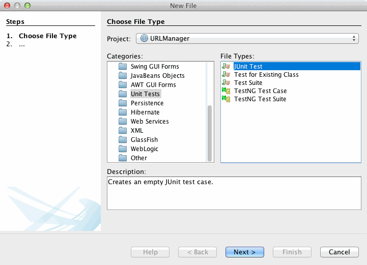Als nächstes wird eine Test-Klasse angelegt. Wenn man NetBeans verwendet, dann öffnet man den New File-Wizard mit Strg+N oder cmd+N und wählt im Schritt Choose file type bei Categories den Wert Unit Tests aus. Unter File types selektiert man JUnit Test und spring mit Next weiter.