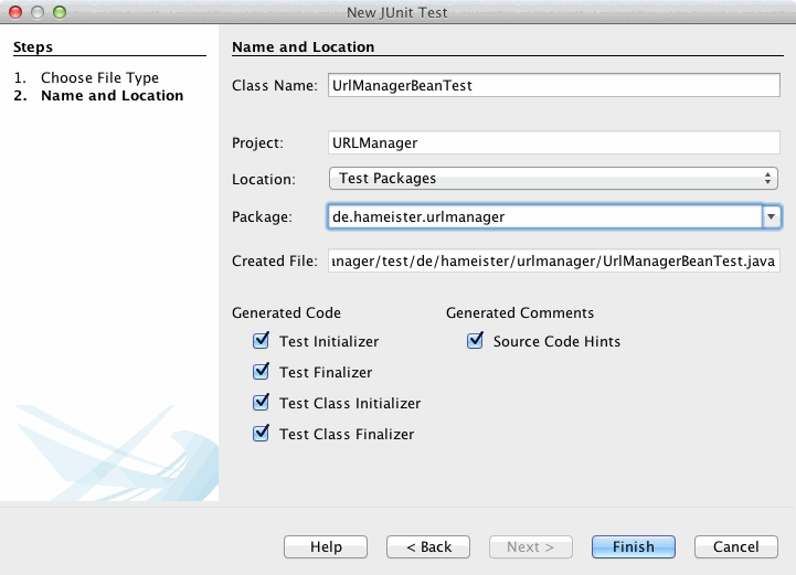Anschließend wird als Class name der Wert UrlManagerBeanTest eingetragen. Als Location sollte immer Test Packages gewählt sein, damit die Test-Klassen in einem eigenen source-Ordner, getrennt von dem zu testenden Code, liegen. Als Package wird der Wert org.hameister.urlmanager eintragen. Abschließend wird der Dialog mit Finish geschlossen.