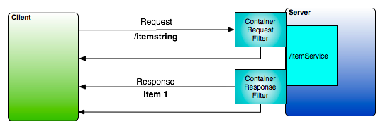 Auf der Abbildung sieht man, wie der Client einen Request an den Service /itemService/itemstring des Servers absetzt. Bevor der Request beim REST-Service ankommt, geht er durch einen ContainerRequestFilter. Falls ein Request gefiltert wird, findet eine Umleitung zurück zum Client statt. Bei der Response verhält es sich ähnlich. Bevor die Response an den Client gesendet wird, l�uft sich durch einen ContainerResponseFilter. Falls der Inhalt der Response herausgefiltert wird, liefert der REST-Server ein leeres Ergebnis zur�ck. Ansonsten kommt das Ergebnis Item 1 beim Client an.