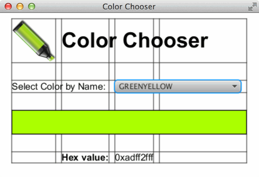 package org.hameister.javafx.colorchooser; import java.lang.reflect.Field; import java.lang.reflect.Modifier; import java.util.HashMap; import java.util.Map; import java.util.logging.Level; import java.util.logging.Logger; import javafx.application.Application; import javafx.beans.value.ChangeListener; import javafx.beans.value.ObservableValue; import javafx.collections.FXCollections; import javafx.collections.ObservableList; import javafx.geometry.Insets; import javafx.scene.Scene; import javafx.scene.control.ComboBox; import javafx.scene.image.Image; import javafx.scene.image.ImageView; import javafx.scene.layout.GridPane; import javafx.scene.paint.Color; import javafx.scene.shape.Rectangle; import javafx.scene.text.Font; import javafx.scene.text.FontWeight; import javafx.scene.text.Text; import javafx.stage.Stage; /** * JavaFXColorChooser. * @author hameister */ public class JavaFXColorChooser extends Application { private static final int COL1 = 0; private static final int COL2 = 1; private static final int COL3 = 2; private static final int ROW1 = 0; private static final int ROW2 = 1; private static final int ROW3 = 2; private static final int ROW4 = 3; private static final int SPAN1 = 1; private static final int SPAN2 = 2; private static final int SPAN3 = 3; private static final int SPAN4 = 4; private Map<String, Color> colorMap = getJavaFXColorMap(); private Rectangle rectangle; private Text hexValue; @Override public void start(Stage primaryStage) { GridPane grid = new GridPane(); grid.setHgap(10); grid.setVgap(30); grid.setPadding(new Insets(10, 20, 10, 20)); // Show the Grid lines. //grid.setGridLinesVisible(true); ImageView pencil = new ImageView(new Image(JavaFXColorChooser.class.getResourceAsStream("StiftSmall.png"))); grid.add(pencil, COL1, ROW1); Text colorChooserTitle = new Text("Color Chooser"); colorChooserTitle.setFont(Font.font("Arial", FontWeight.BOLD, 36)); grid.add(colorChooserTitle, COL2, ROW1, SPAN3, SPAN1); Text colorByName = new Text("Select Color by Name:"); colorByName.setFont(Font.font("Arial", FontWeight.NORMAL, 16)); grid.add(colorByName, COL1, ROW2, SPAN2, SPAN1); // Sort the colors ObservableList<String> colors = FXCollections.observableArrayList(colorMap.keySet()); FXCollections.sort(colors); ComboBox box = new ComboBox(colors); box.getSelectionModel().selectFirst(); box.valueProperty().addListener(new ChangeListener<String>() { @Override public void changed(ObservableValue ov, String oldColor, String newColor) { rectangle.setFill(colorMap.get(newColor)); hexValue.setText((colorMap.get(newColor).toString())); } }); grid.add(box, COL3, ROW2, SPAN2, SPAN1); rectangle = new Rectangle(400, 40); grid.add(rectangle, COL1, ROW3, SPAN4, SPAN1); rectangle.setFill(colorMap.get(box.getSelectionModel().getSelectedItem().toString())); rectangle.setStroke(Color.BLACK); Text hex = new Text("Hex value:"); hex.setFont(Font.font("Arial", FontWeight.BOLD, 16)); grid.add(hex, COL2, ROW4); hexValue = new Text(colorMap.get(box.getSelectionModel().getSelectedItem().toString()).toString()); hexValue.setFont(Font.font("Arial", FontWeight.NORMAL, 16)); grid.add(hexValue, COL3, ROW4); Scene scene = new Scene(grid, 440, 280); primaryStage.setTitle("Color Chooser"); primaryStage.setScene(scene); primaryStage.show(); } public static void main(String[] args) { launch(args); } }