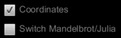 : Switch between Mandelbrot and Julia set. Also to enable/disable a coordinate system.ChoiceBox