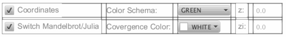 public class JavaFXFractal extends Application { private static final int CANVAS_WIDTH = 750; private static final int CANVAS_HEIGHT = 600; // Left and right border private static final int X_OFFSET = 100; // Top and Bottom border private static final int Y_OFFSET = 50; // Width of the Application Scene private static final int WIDTH = (2 * X_OFFSET) + CANVAS_WIDTH; // Height of the Application Scene private static final int HEIGHT = (2 * Y_OFFSET) + CANVAS_HEIGHT; // Size of the coordinate system for the Mandelbrot set private static double MANDELBROT_RE_MIN = -2; private static double MANDELBROT_RE_MAX = 1; private static double MANDELBROT_IM_MIN = -1; private static double MANDELBROT_IM_MAX = 1; // Size of the coordinate system for the Julia set private static double JULIA_RE_MIN = -1.5; private static double JULIA_RE_MAX = 1.5; private static double JULIA_IM_MIN = -1.5; private static double JULIA_IM_MAX = 1.5; // List with the Nodes for the Coordinate system (Lines, Text) private List<Node> coordinateSystemNodes; // Main Panel with den Mandelbrot set private Pane fractalRootPane; // Canvas for the Mandelbrot oder Julia set private Canvas canvas = new Canvas(CANVAS_WIDTH, CANVAS_HEIGHT); private CheckBox showCoordinateSystem; private CheckBox switchMandelbrotJuliaSet; private ChoiceBox colorSchemeChoiceBox; private ColorPicker convergenceColorPicker; private TextField z; private TextField zi; private MandelbrotBean bean; @Override public void start(Stage primaryStage) { fractalRootPane = new Pane(); // Move Canvas to the correct position canvas.setLayoutX(X_OFFSET); canvas.setLayoutY(Y_OFFSET); // Paint canvas with initial Mandelbrot set fractalRootPane.getChildren().add(canvas); bean = new MandelbrotBean(50, MANDELBROT_RE_MIN, MANDELBROT_RE_MAX, MANDELBROT_IM_MIN, MANDELBROT_IM_MAX, 0, 0); paintSet(canvas.getGraphicsContext2D(), bean); // Create controls coordinateSystemNodes = createCoordinateSystem(bean); switchMandelbrotJuliaSet = createMandelbrotJuliaCheckBox(); showCoordinateSystem = createShowCoordinateCheckBox(); convergenceColorPicker = createConvergenceColorPicker(); colorSchemeChoiceBox = createSchemaChoiceBox(); z = createZTextField(); zi = createZiTextField(); // Grid layout for the controls GridPane grid = new GridPane(); grid.setHgap(10); // LEFT, RIGHT grid.setVgap(5); // TOP, BOTTOM grid.setPadding(new Insets(10, 10, 0, 10)); // Show the GridLines //grid.setGridLinesVisible(true); grid.add(showCoordinateSystem, 0, 0); grid.add(switchMandelbrotJuliaSet, 0, 1); grid.add(TextBuilder.create().text("Color Schema: ").styleClass("fractal-text").build(), 1, 0); grid.add(TextBuilder.create().text("Convergence Color: ").styleClass("fractal-text").build(), 1, 1); grid.add(colorSchemeChoiceBox, 2, 0); grid.add(convergenceColorPicker, 2, 1); grid.add(LabelBuilder.create().text("z:").styleClass("fractal-text").build(), 3, 0); grid.add(LabelBuilder.create().text("zi:").styleClass("fractal-text").build(), 3, 1); grid.add(z, 4, 0); grid.add(zi, 4, 1); BorderPane border = new BorderPane(); border.setTop(grid); border.setCenter(fractalRootPane); fractalRootPane.getChildren().addAll(coordinateSystemNodes); Scene scene = new Scene(border, WIDTH, HEIGHT); primaryStage.setTitle("JavaFX Fractal"); primaryStage.setScene(scene); primaryStage.getScene().getStylesheets().add("fractal"); primaryStage.show(); } ... public static void main(String[] args) { launch(args); } }