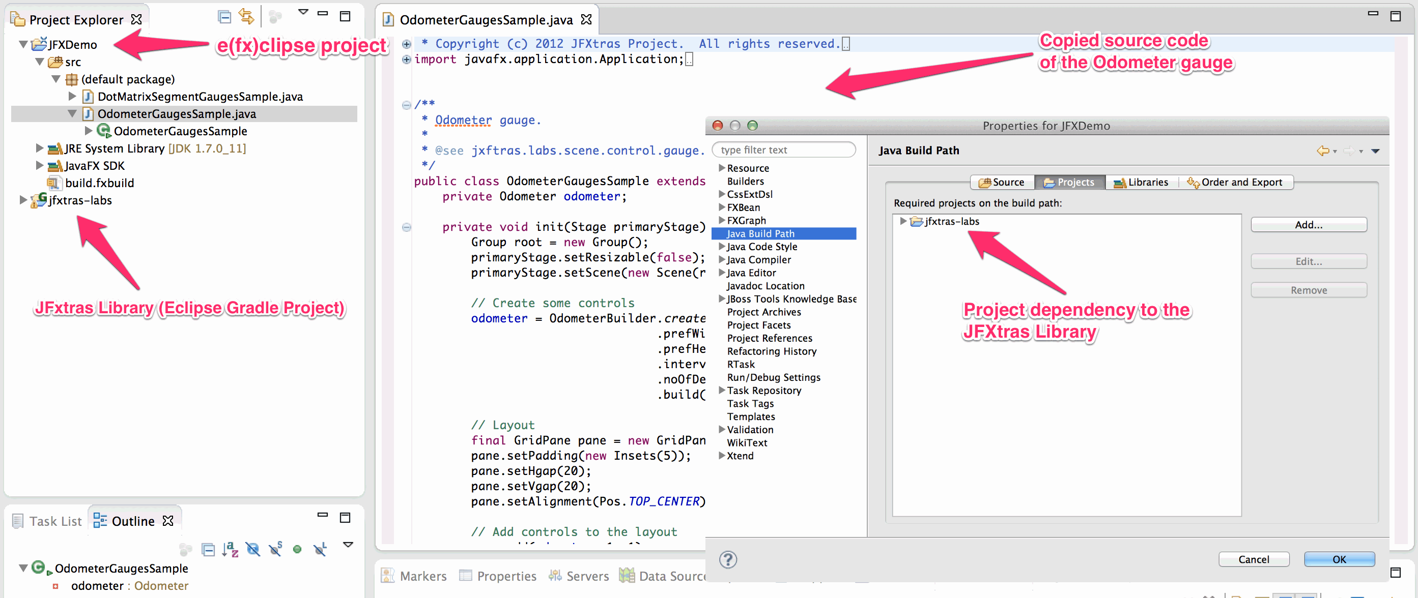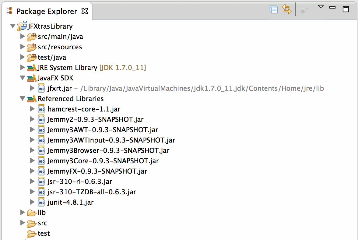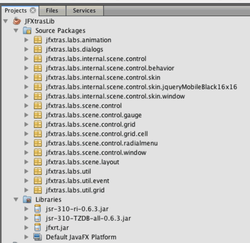 That's all. Now you can create a JavaFX project in you IDE and set a dependency to the JFXtras library project, use all components and debug into the classes of the library. If you want to check if everything is ok, I recommend the JFXtras Ensemble project: JFXtras Ensemble. This is a demo application which uses all components of the JFXtras library and contains code snippets which shows how to use the components.