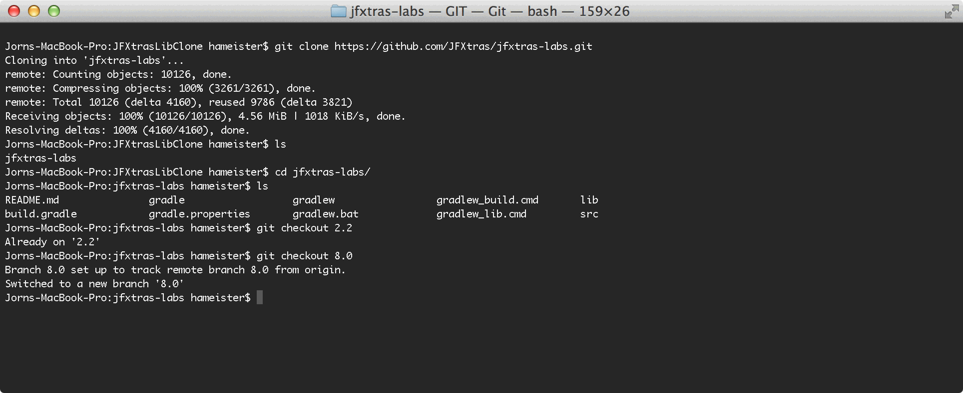 The other way is to clone the Git respository of the JFXtras library. Simply use the following command in a terminal window.