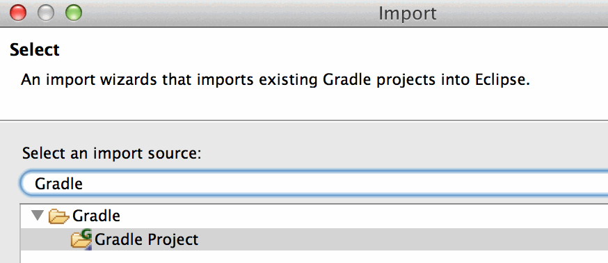 After installing the Gradle integration you have to choose File->Import in the menue bar. In the first wizard step you select Gradle Project.