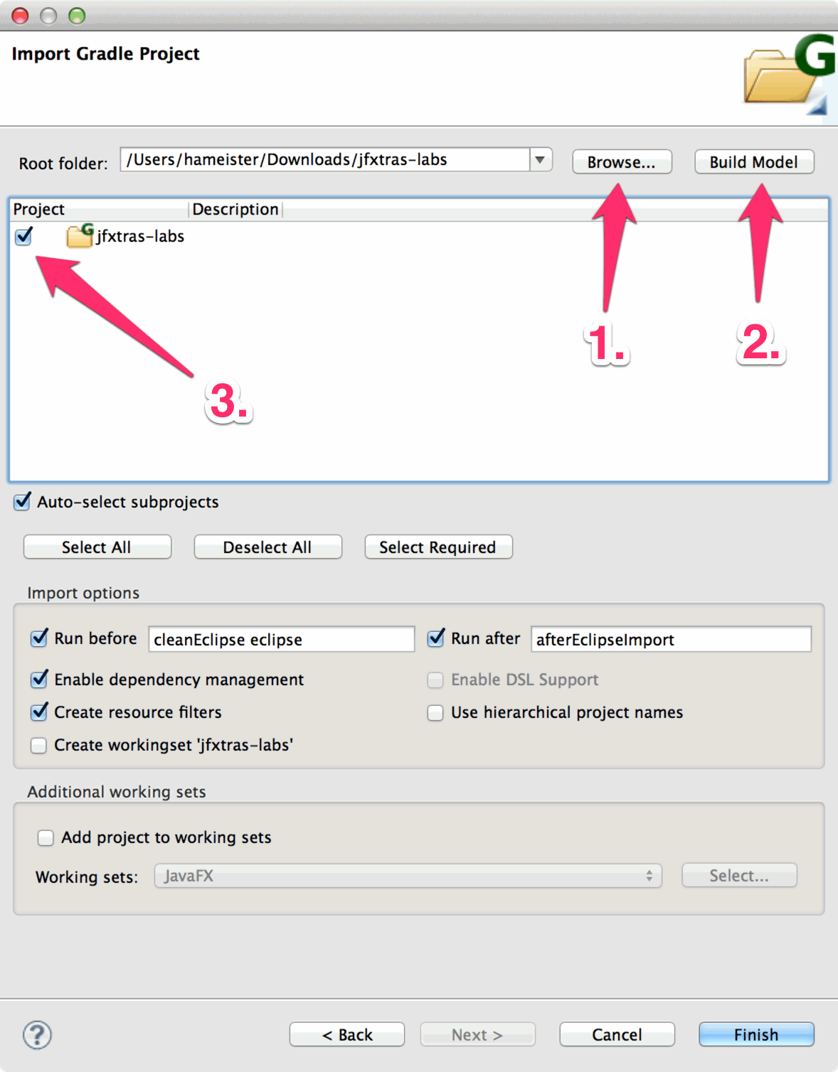 In the second wizard step you 1. choose the directory with the JFXtras library. 2. build the model and 3. select the Gradle project for the import.