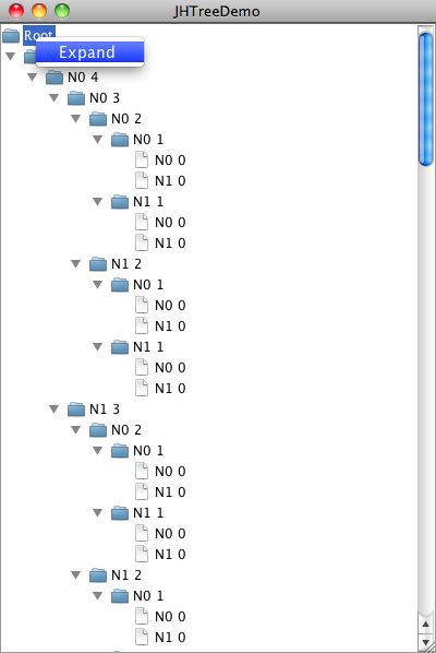 import java.awt.GridLayout; import java.awt.event.ActionEvent; import java.awt.event.ActionListener; import java.awt.event.MouseAdapter; import java.awt.event.MouseEvent; import javax.swing.JMenuItem; import javax.swing.JPanel; import javax.swing.JPopupMenu; import javax.swing.JScrollPane; import javax.swing.tree.DefaultMutableTreeNode; import javax.swing.tree.TreeSelectionModel; /** * @author hameister * */ public class JHTreePanel extends JPanel implements ActionListener { private JHTree tree; private int nodeCount = 0; private int deep = 7; private int numberOfNodes = 4; public JHTreePanel() { super(new GridLayout(1,0)); //Create the nodes. DefaultMutableTreeNode top =new DefaultMutableTreeNode("Root"); createRecursiveTree(top, deep, numberOfNodes); //Create a tree that allows one selection at a time. tree = new JHTree(top); tree.getSelectionModel().setSelectionMode(TreeSelectionModel.SINGLE_TREE_SELECTION); //Create the scroll pane and add the tree to it. JScrollPane treeView = new JScrollPane(tree); add(treeView); JPopupMenu popup = new JPopupMenu(); JMenuItem menuItem = new JMenuItem("Expand"); menuItem.addActionListener(this); popup.add(menuItem); tree.addMouseListener(new JHPopupListener(popup)); }