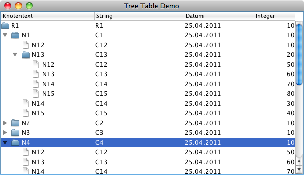 Die folgenden beiden Abbildungen zeigen Screenshots der fertigen TreeTable. Einmal auf dem Mac und einmal auf einem Windows-Rechner.