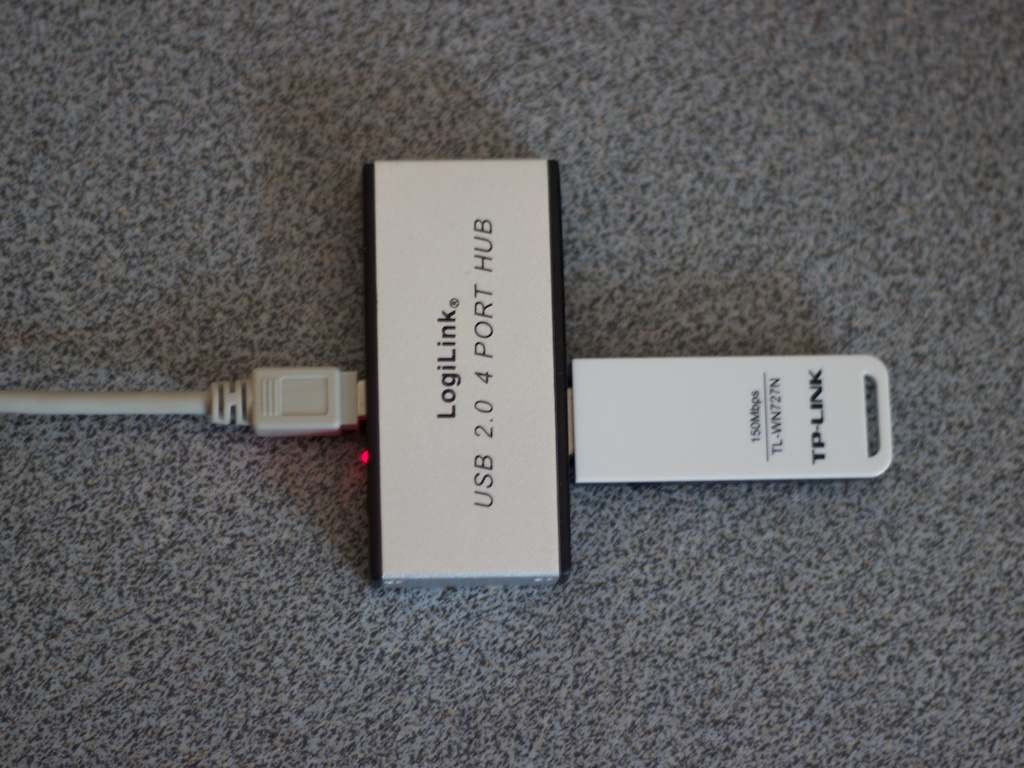 Wenn die Verbindung offen ist, wird der WLAN-Stick an einen der USB-Ports angeschlossen. Ich empfehle einen USB-Hub zu benutzen. Grund dafür ist, dass es mir nach dem Einrichten des WLan hin und wieder passiert ist, dass ich keine Verbindung mehr zum Raspberry herstellen konnte. Grund dafür war wohl ein Problem mit dem WLan-Treiber. Durch den USB-Hub ist es problemlos möglich, den WLan-Stick zu entfernen und erneut mit dem Hub zu verbinden. Wenn man den USB-Port direkt am RaspberryPi verwendet, dann startet dieser sich neu und laufende Prozesse werden beendet.