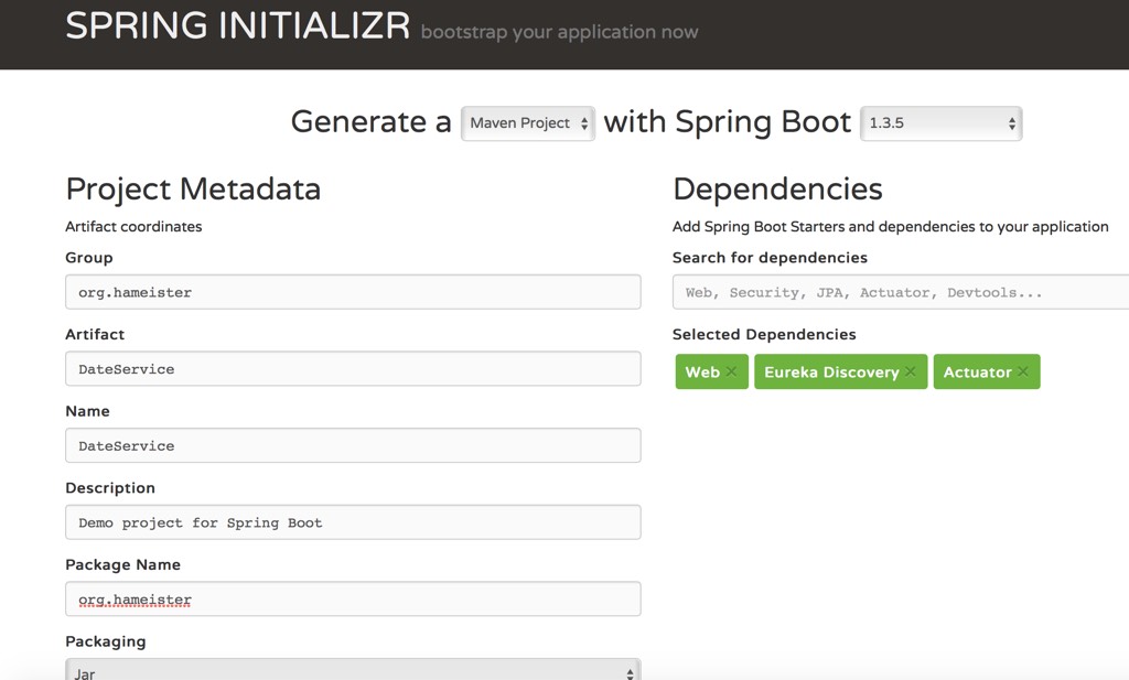 Im nächsten Stritt erstellen wir den DateService. Gestartet wird wieder bei start.spring.io. Dort wählt man Web, Actuator und Eureka Discovery aus und erstellt das Projekt-Template und öffnet es in einer IDE.