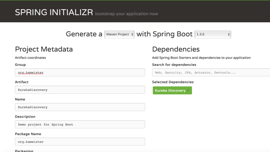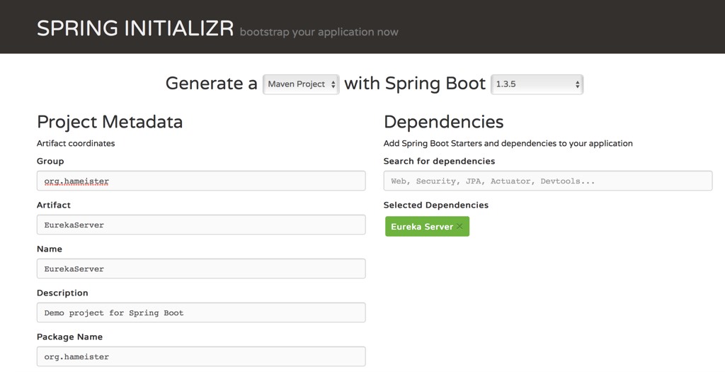 Los geht es auf der Seite start.spring.io. Wo der Eureka Server ausgewählt wird, um dann das Projekt-Template zu erstellen.