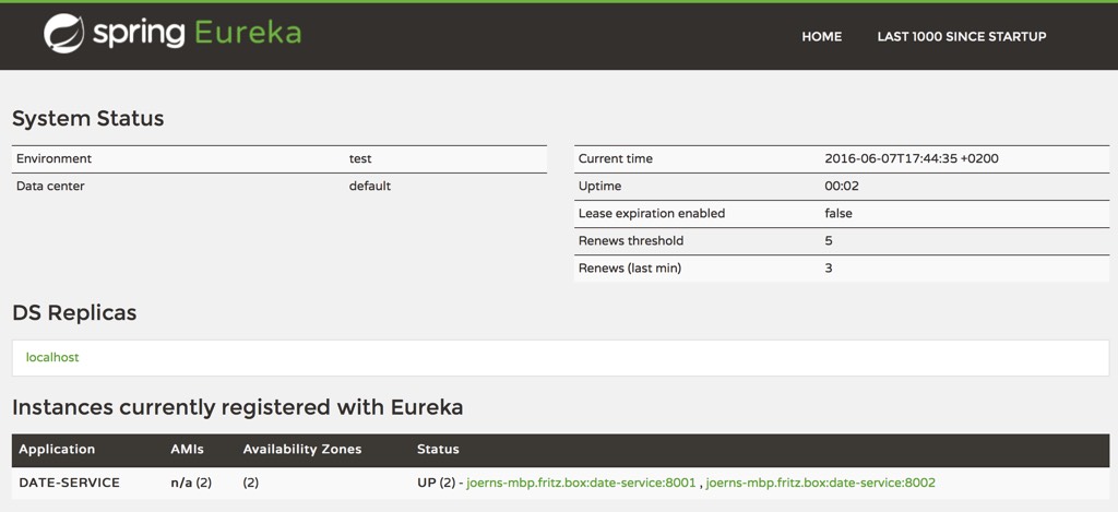 Wenn man vorher den Eureka Server gestartet hat, dann sollten unter der Url: localhost:8761 zwei Instanzen des DATE-SERVICE zu sehen sein: