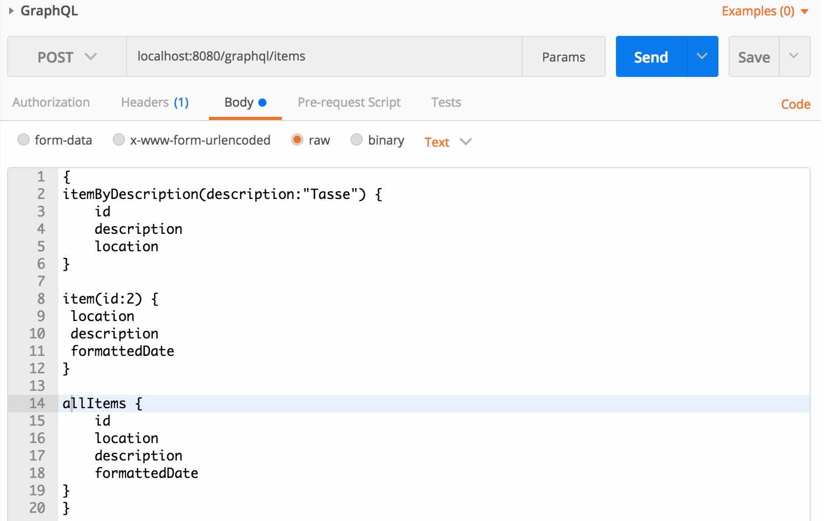 schema { query : Query } type Query { allItems: [Item] item(id: Long): Item itemByDescription(description: String): [Item] } type Item { id : Long description: String location: String formattedDate: String }