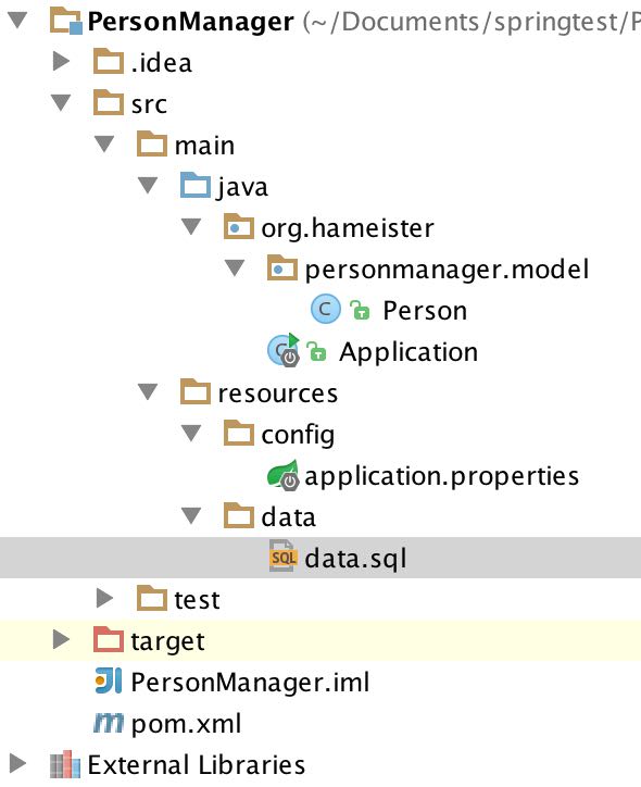 <project xmlns="http://maven.apache.org/POM/4.0.0" xmlns:xsi="http://www.w3.org/2001/XMLSchema-instance" xsi:schemaLocation="http://maven.apache.org/POM/4.0.0 http://maven.apache.org/maven-v4_0_0.xsd"> <modelVersion>4.0.0</modelVersion> <groupId>org.hameister</groupId> <artifactId>PersonManager</artifactId> <version>1.0-SNAPSHOT</version> <parent> <groupId>org.springframework.boot</groupId> <artifactId>spring-boot-starter-parent</artifactId> <version>1.2.1.RELEASE</version> </parent> <dependencies> <dependency> <groupId>org.springframework.boot</groupId> <artifactId>spring-boot-starter-web</artifactId> </dependency> <dependency> <groupId>org.springframework.boot</groupId> <artifactId>spring-boot-starter-data-jpa</artifactId> </dependency> <dependency> <groupId>com.h2database</groupId> <artifactId>h2</artifactId> </dependency> <dependency> <groupId>junit</groupId> <artifactId>junit</artifactId> </dependency> </dependencies> <build> <plugins> <plugin> <groupId>org.springframework.boot</groupId> <artifactId>spring-boot-maven-plugin</artifactId> </plugin> </plugins> </build> </project>