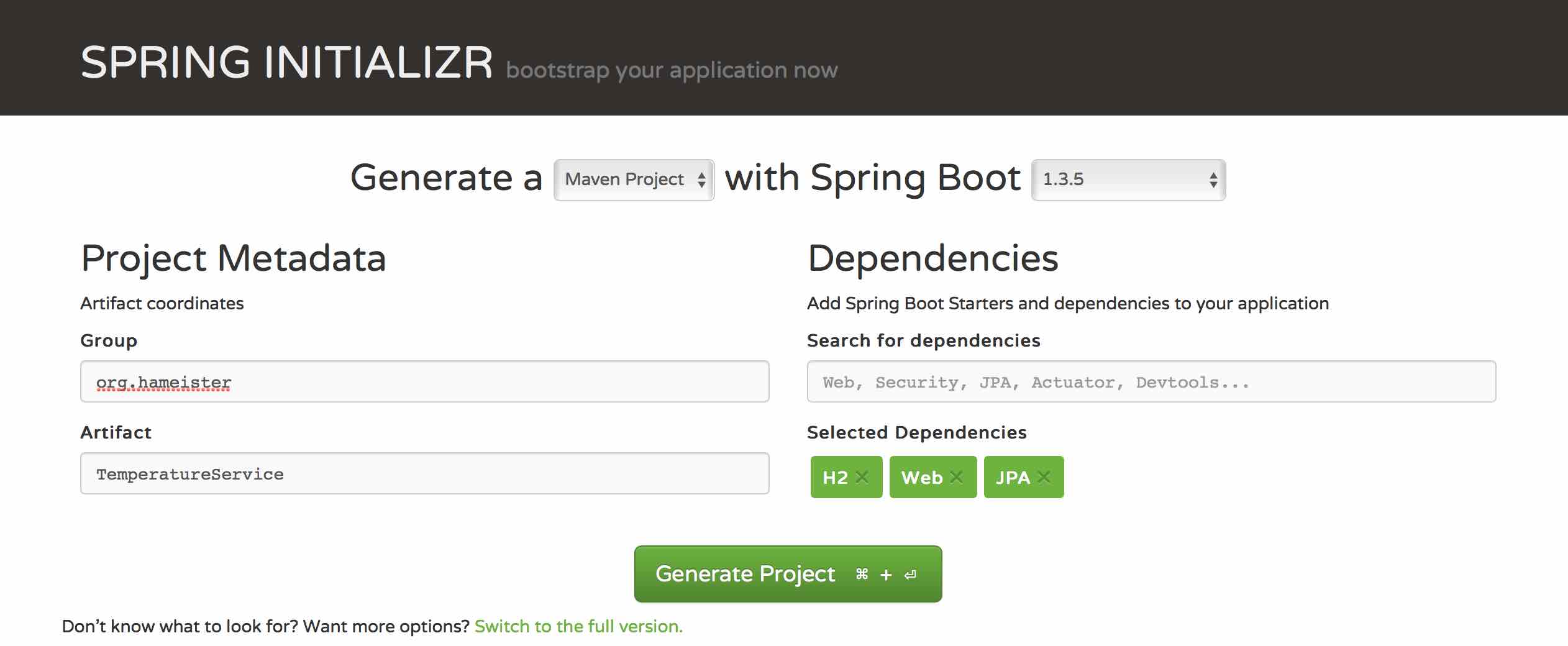 Dort wählt man H2, Web und JPA aus und erstellt mit Generate Project ein Maven-Projekt mit allen benötigten Abhängigkeiten.