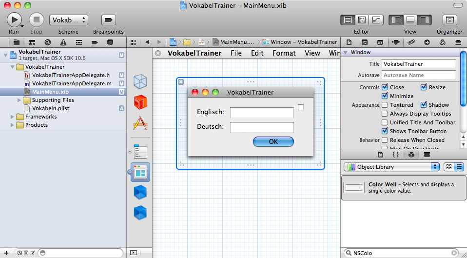 werden die deutschen und englischen Vokabeln angezeigt. Die NSColorWell