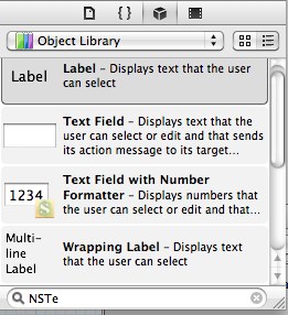 In der ObjectLibrary kann durch Tippen der Anfangsbuchstaben die angezeigte Komponentenmenge reduziert werden. Im folgenden Bild wird nach NSTe gesucht, woraufhin das Label und das Text Field angezeigt werden.