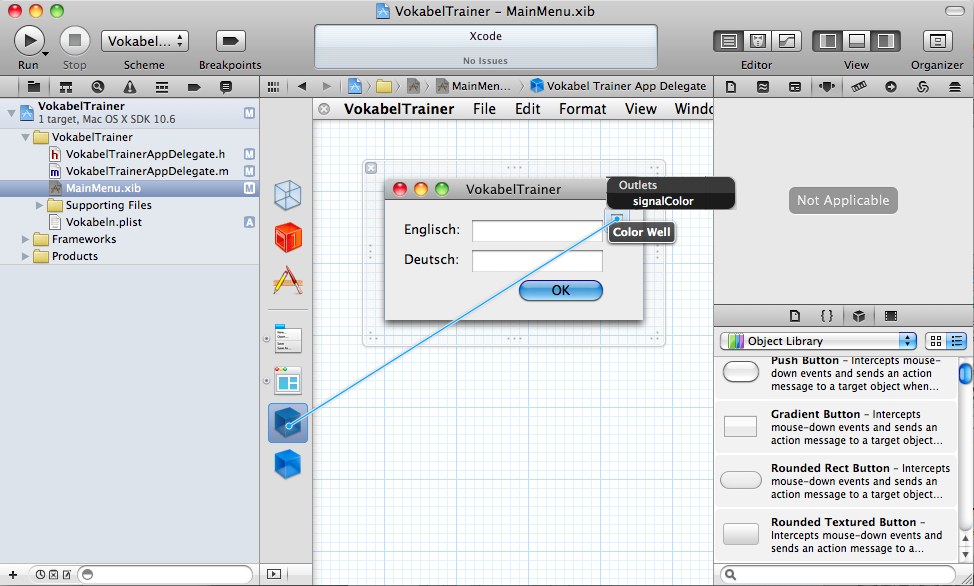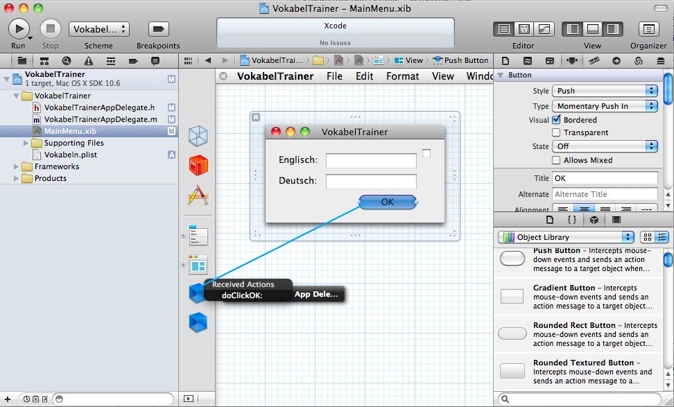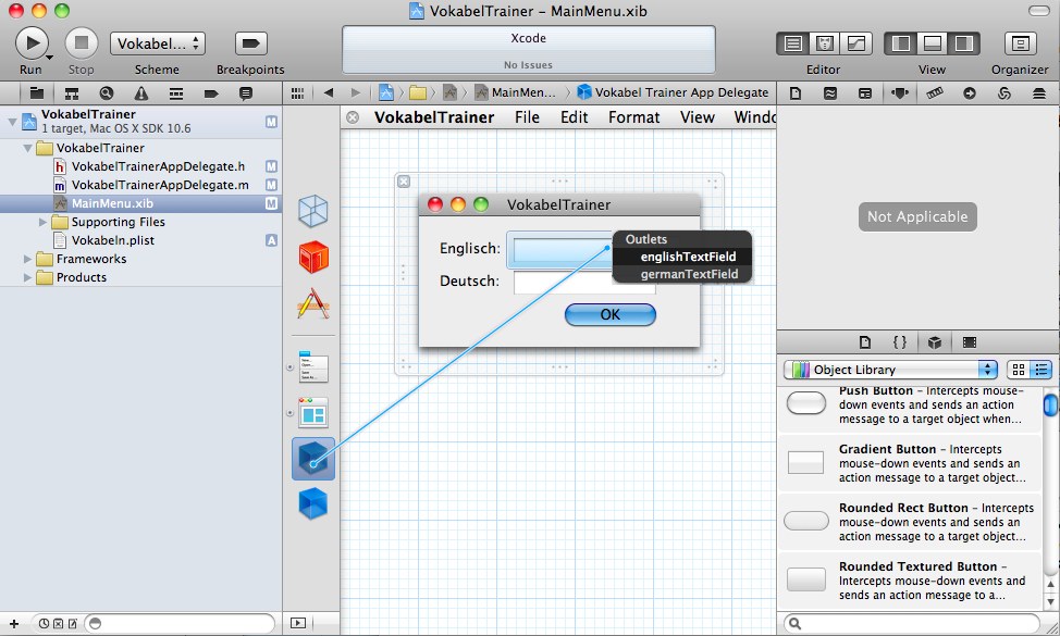 Was jetzt noch fehlt, sind die Verbindungen zum Controller. Als erstes werden die Textfelder verbunden. Dazu selektiert man die Vokabel Trainer App Delegate (Controller) mit der Mouse und zieht den Cursor per ctrl-Drag auf das NSTextField