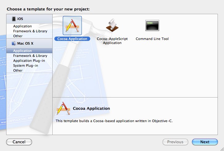 Als erstes wird eine neues Projekt angelegt (⌘+⇧+N). In dem Fenster wird als Template Cocoa Application gewählt.