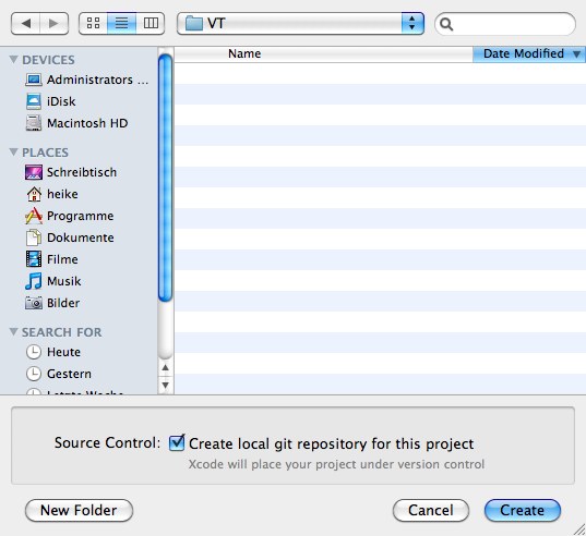 Dieser Dialog wird wiederum mit Next bestätigt. Im abschließenden Dialog kann ein Order gewählt werden im dem das Xcode-Projekt abgelegt werden soll und ob ein lokales Git-Repository benötigt wird.