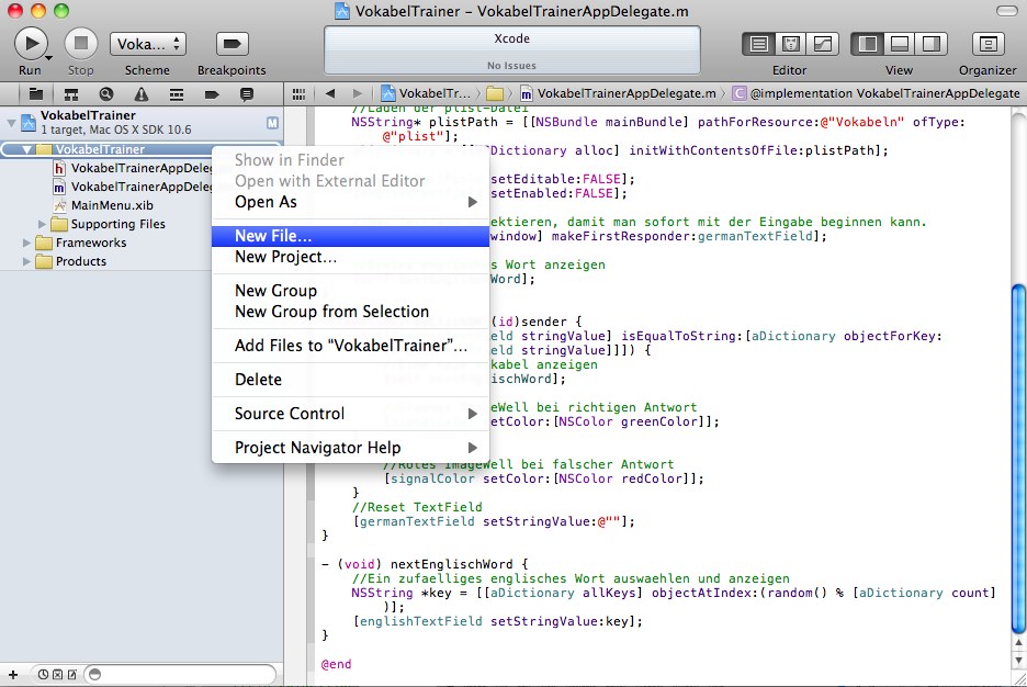 Wie schon erwähnt, sollen die Vokabeln in einer plist-Datei abgelegt werden. Um eine neue plist-Datei zu erstellen, selektiert man den Folder VokabelTrainer und wählt im Kontextmenü New File... aus.