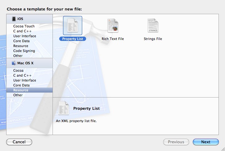 In dem Datei-Dialog wird erst Resource und dann Property List ausgewählt.