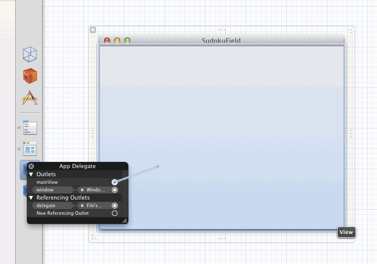 In der xib-Datei muss dann noch per Drag&Drop eine Verbindung zwischen den beiden Outlets hergestellt werden. Dazu wechselt man zu der xib-Datei MainMenu.xib und stellt die Verbindung her.