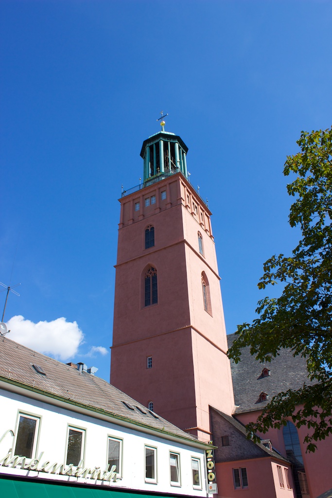 Die Stadtkirche in Darmstadt. Im Vordergrund das Cafe Zoo.