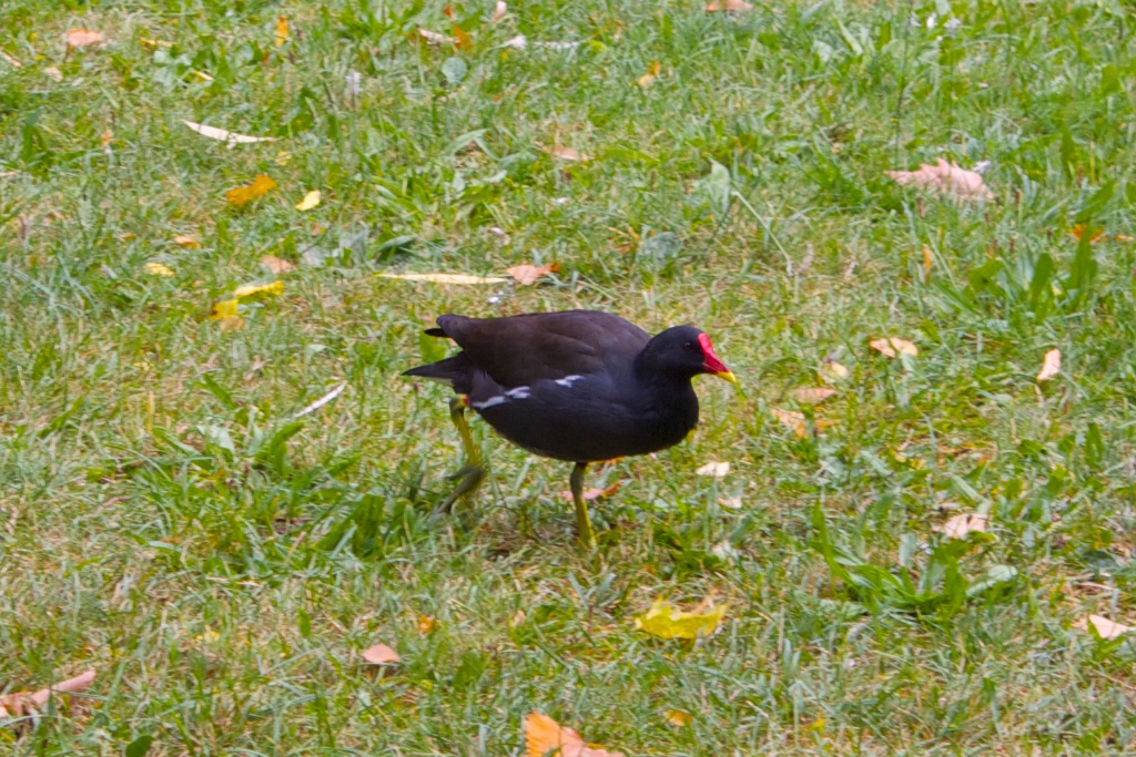 Der schwarz-rot-gelbe Schnabel des Teichhuhn sieht witzig aus.