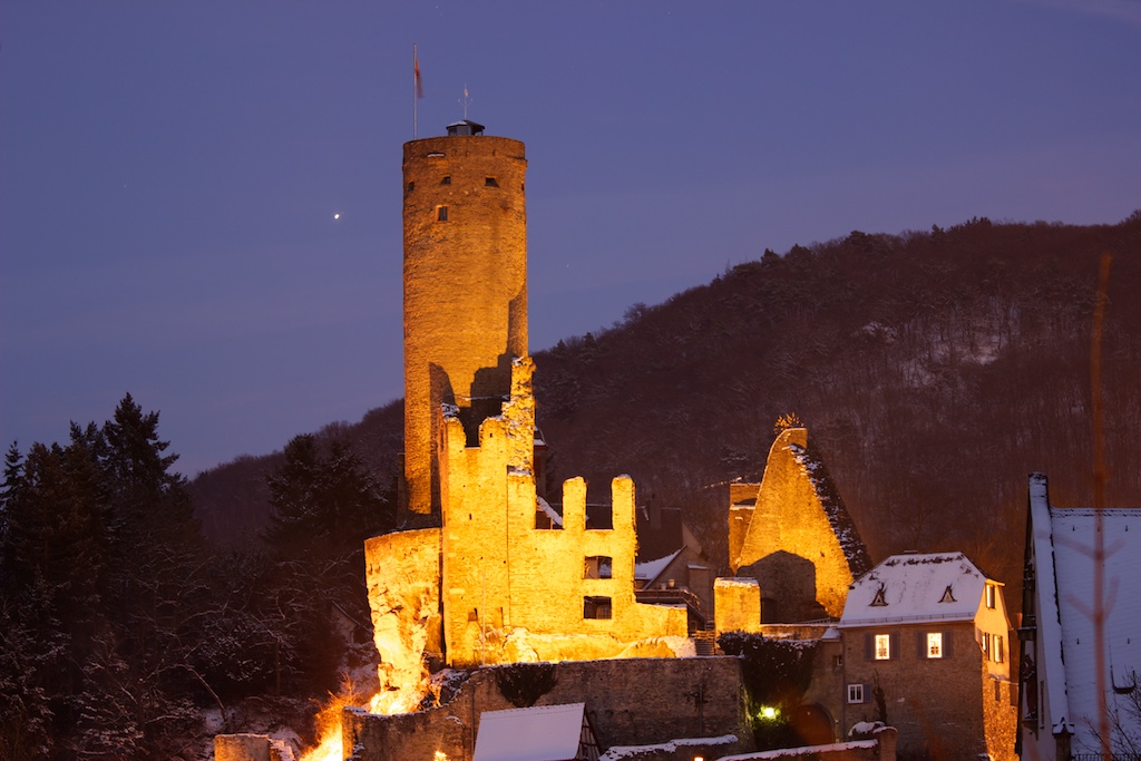Die beleuchtete Eppsteiner Burg. Im Hintergrund ist der Jupiter gut zu sehen.