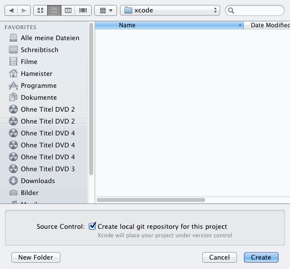 Gestartet wird mit dem Anlegen einer iOS Application (⌘+⇧+N). In dem Fenster wählt man unter iOS den Eintrag Application aus. Als Template wird Empty Application selektiert.
