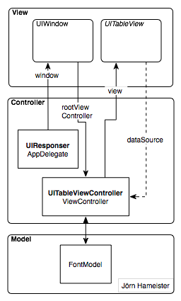 Die folgende Abbildung zeigt die Architektur der fertigen App. Wie man sieht, wurde das Model-View-Controller-Pattern verwendet. Im Model werden die Font-Typen verwaltet und dem Controller bereitgestellt. Die View zeigt die Font-Typen an und benutzt für die Datenbeschaffung den Controller, d.h. die UITableViewDataSource