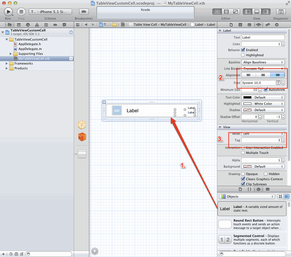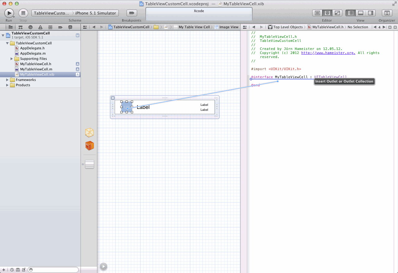// // MyTableViewCell.h // TableViewCustomCell // // Created by Jörn Hameister on 24.05.12. // Copyright (c) 2012 http://www.hameister.org. All rights reserved. // #import <UIKit/UIKit.h> @interface MyTableViewCell : UITableViewCell @property (weak, nonatomic) IBOutlet UIImageView *cellImage; @property (weak, nonatomic) IBOutlet UILabel *mainLabel; @property (weak, nonatomic) IBOutlet UILabel *dateLabel; @property (weak, nonatomic) IBOutlet UILabel *timeLabel; @end