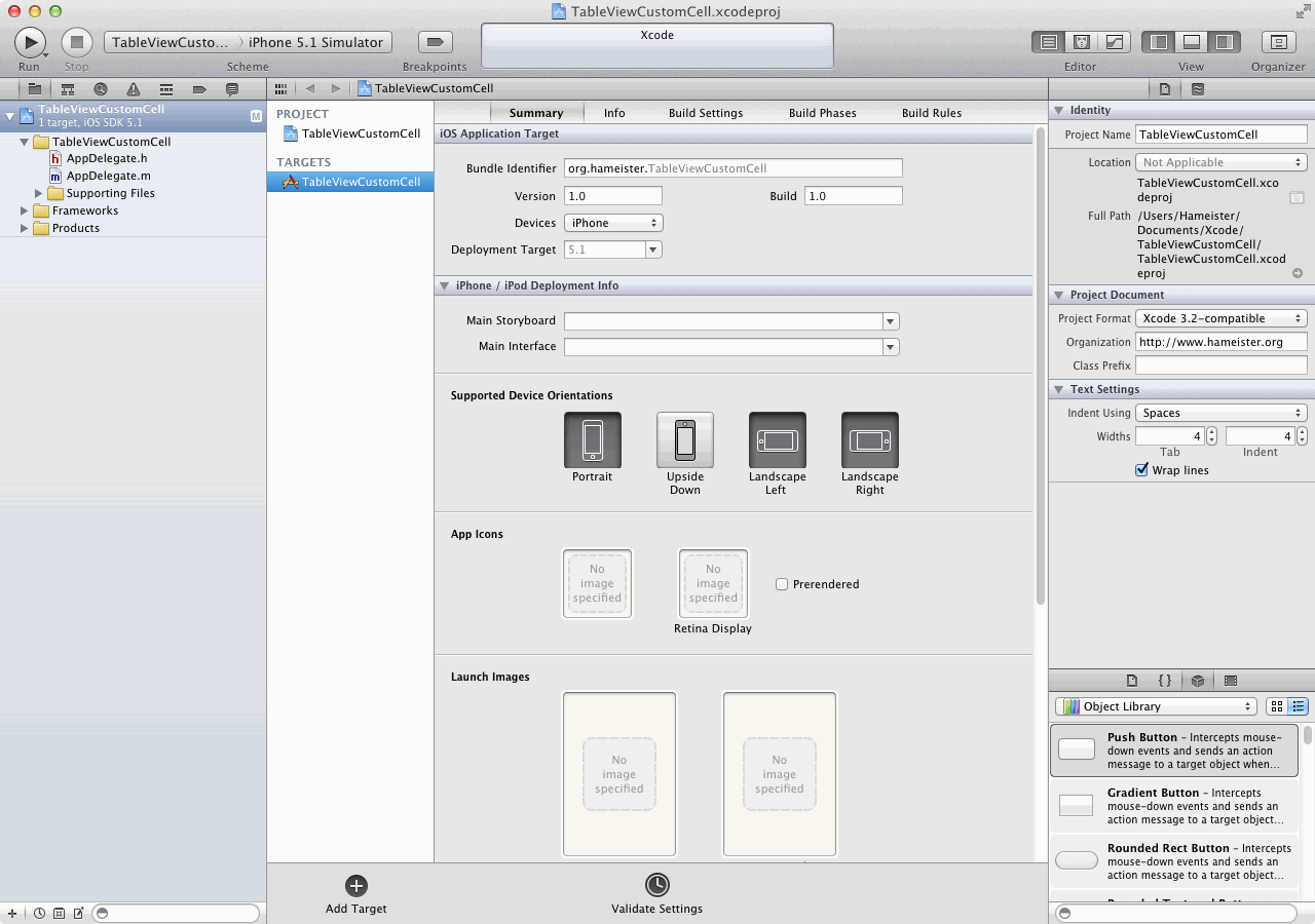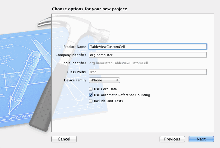 Als Product Name für die App verwenden wir TableViewCustomCell.